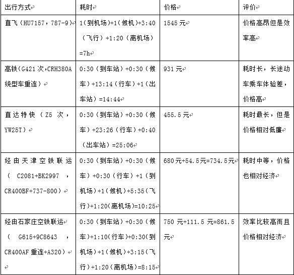 现在,我们以北京到南宁为例,对比一下几种出行方式间的各自优缺点(直飞和空铁联运时选择航班和车次选择价格最低的方案,动车均为二等座,直特为硬卧,数据采集自2018年11月25日),出发地假设是国贸地铁站,目的地假设是广西省政府。市区交通耗时来源高德地图,机场候机时间取1小时,火车站候车时间取30分钟,出站出机场均为20分钟且和到达目的地合并计算。