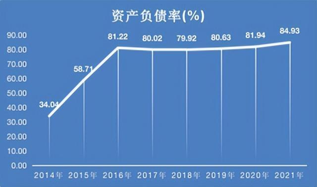 但与此同时,钜盛华的负债也几十倍的增加。总负债由2014年的96.37亿元增加2021年的4715.46亿元,暴增4793.08%。资产负债率从2014年的34.04%增至2021年的84.93%。